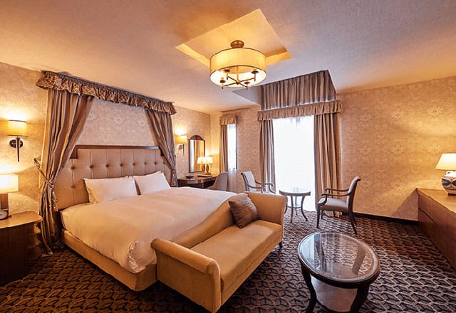 The interior is characterized by a classical and tranquil atmosphere, featuring European antiques throughout. In contrast to the imposing exterior, the interior design offers warm and elegant finishes that create refined moments for discerning adults. All guest rooms are spaciously designed with a minimum of 48 square meters, offering 10 different room types including “Asama View Deluxe” and “Premium Twin” rooms. Comfortable sleep is ensured with king-size and double beds, complemented by well-designed, user-friendly bathroom facilities.